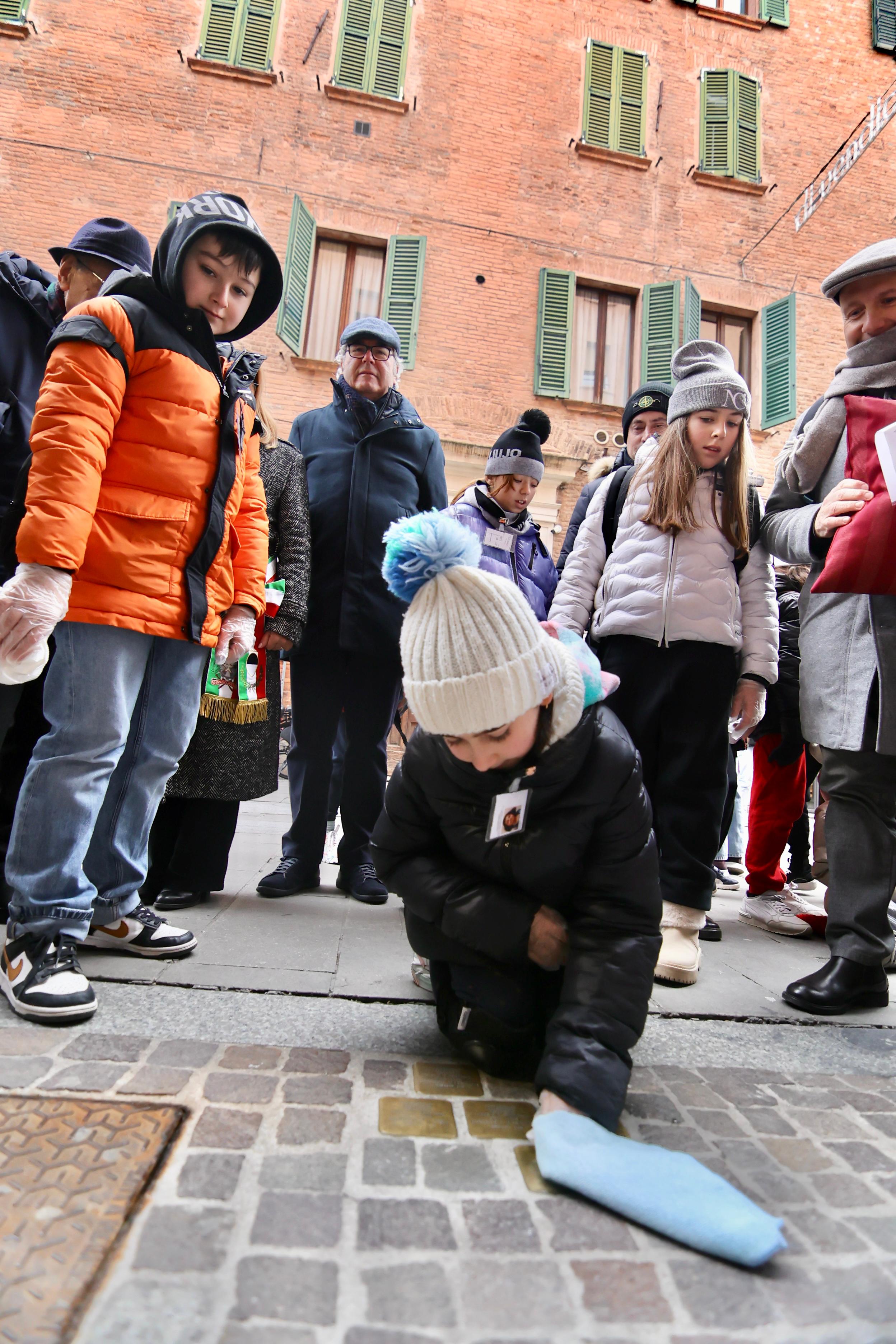 Di fronte alla Sinagoga - ed esattamente al civico 88 di via Mazzini - la classe 5 B dell'istituto comprensivo "Perlasca"- Plesso Primaria "Mosti" ha preso in carico le 5 pietre dedicate alla famiglia Fink-Bassani-Lampronti. A seguire, alle 12.30, al civico 14 la classe 4B del liceo artistico "Dosso Dossi" si è occupata delle 5 pietre dedicate alla famiglia Rietti-Cavalieri. L'opera si concluderà giovedì 22 gennaio alle ore 12.30 davanti al civico 85 con l'intervento della classe 2D della scuola "Dante Alighieri" sulle 5 pietre dedicate alla famiglia Forti-Jesi-Lampronti.