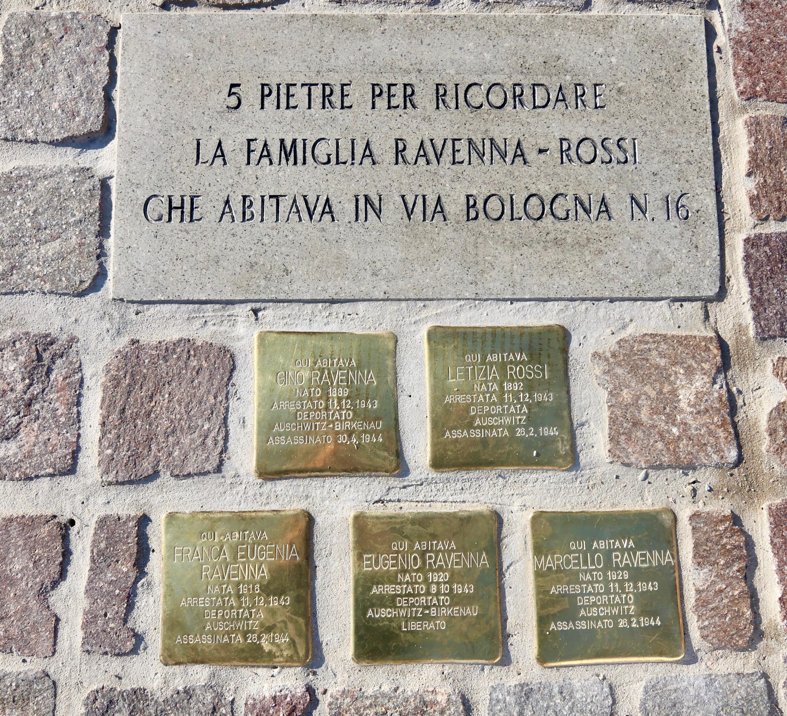 La famiglia Ravenna-Rossi era composta da Gino Ravenna, Letizia Rossi, Franca Eugenia Ravenna, Eugenio Ravenna e Marcello Ravenna ed è stata arrestata a Domodossola nel 1943, mentre cercava di raggiungere la Svizzera. Trasferiti prima a Ferrara nel carcere di via Piangipane e poi nel Campo di transito di Fossoli (MO), il 22 febbraio 1944 arrivarono nel lager di Auschwitz, dove tutti troveranno la morte tranne Eugenio, uno dei pochissimi sopravvissuti ferraresi alla Shoah. Cugino di Giorgio Bassani, la sua storia ispirerà il racconto Una lapide in via Mazzini, dove lo scrittore trasformerà Eugenio nel personaggio di Geo Josz.
