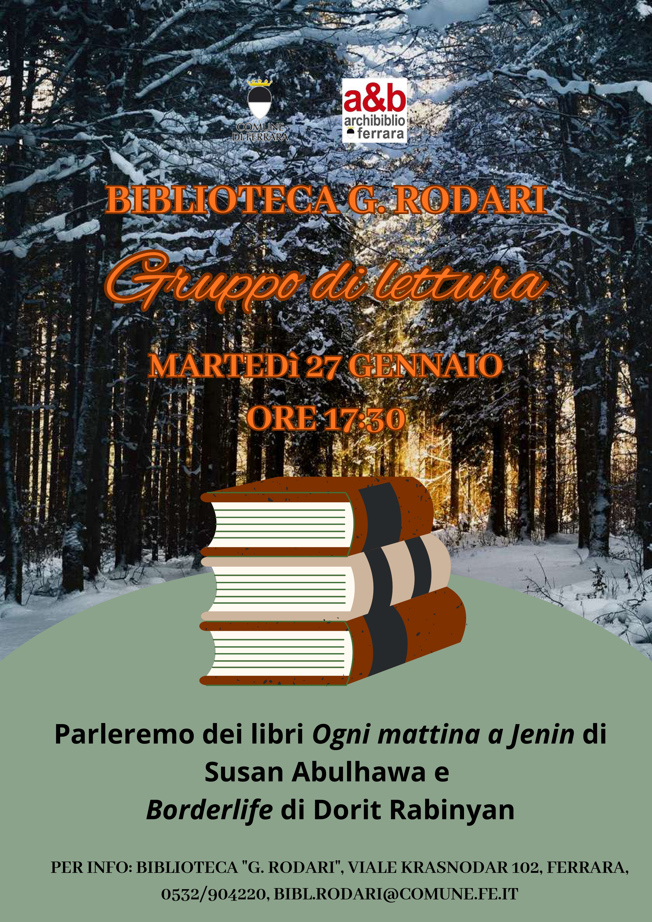 In occasione del Giorno della Memoria il gruppo di lettura della biblioteca comunale Rodari propone una riflessione sulla storia presente e passata. Sarà infatti dedicato ai libri "Ogni mattina a Jenin" di Susan Abulhawa e "Borderlife" di Dorit Rabinyan il nuovo incontro del gruppo in calendario per martedì 27 gennaio 2026 alle 17:30 nella sede di viale Krasnodar 102, a Ferrara.