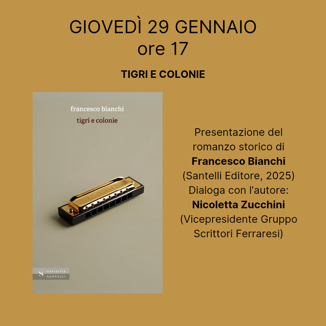 Si snodano sullo sfondo della storia del colonialismo italiano, le vicende familiari raccontate da Francesco Bianchi nel romanzo dal titolo "Tigri e colonie" (Santelli Editore, 2025) che giovedì 29 gennaio 2026 alle 17:00 sarà presentato nella sala Agnelli della biblioteca comunale Ariostea (via delle Scienze 17, Ferrara).