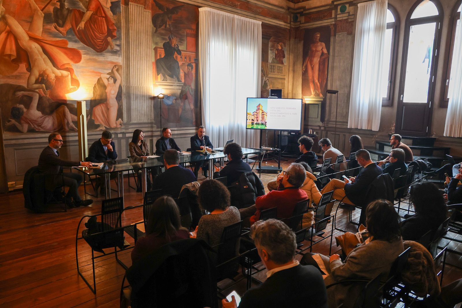 DOCUMENTAZIONE scaricabile in fondo alla pagina: foto di Ferrara con turisti in visita al Castello e a Palazzo dei Diamanti, e foto degli assessori Frisoni e Fornasini in conferenza stampa.