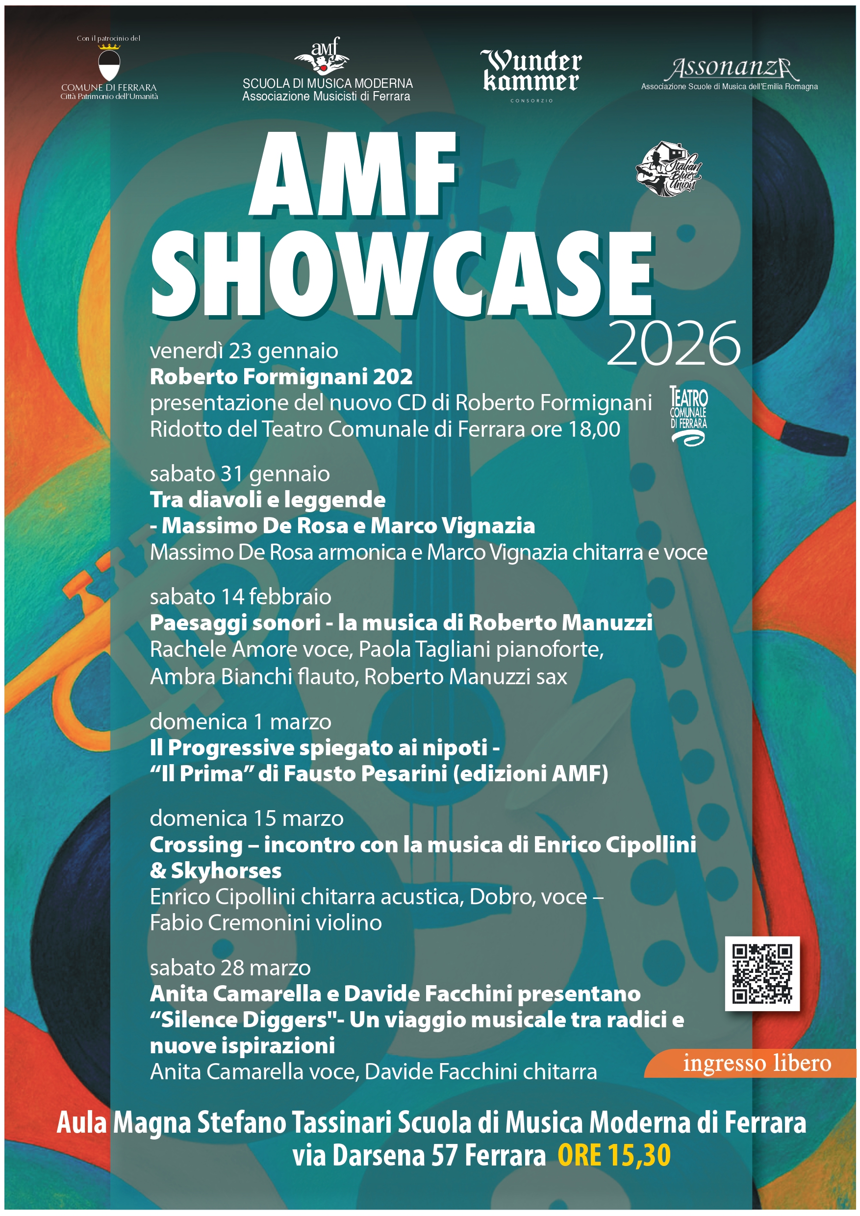 L'incontro rientra nel ciclo di appuntamenti ad ingresso libero "Amf Showcase", organizzati dalla Scuola di Musica Moderna, Associazione Musicisti di Ferrara Aps in collaborazione con Assonanza, Associazione delle Scuole di Musica della Regione Emilia-Romagna, con il patrocinio e il contributo del Comune di Ferrara.