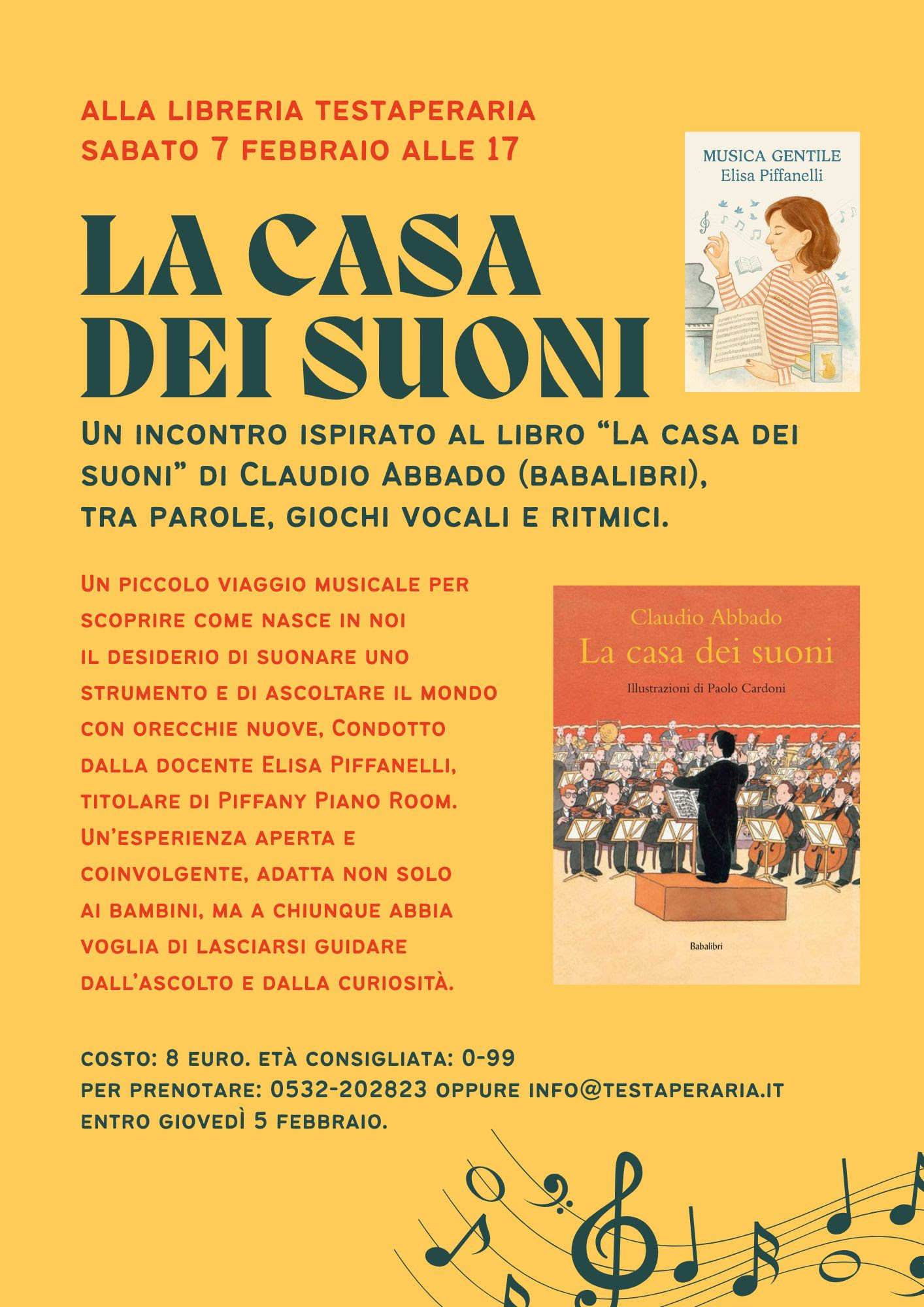 Come facciamo a far diventare i suoni la nostra casa? Ispirato al libro "La casa dei suoni" di Claudio Abbado (Babalibri), l'incontro si sviluppa tra parole e giochi vocali e ritmici. Attraverso il pensiero del grande Maestro i suoni diventano racconto, emozione, casa. Il pomeriggio è condotto da Elisa Piffanelli, docente e fondatrice di Piffany Piano Room. Un'esperienza aperta e coinvolgente per chiunque abbia voglia di lasciarsi guidare dall'ascolto e dalla curiosità.