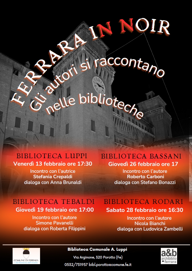 Le biblioteche comunali ferraresi propongono una rassegna dedicata ad autori rappresentativi del genere giallo/noir, con incontri e presentazioni che si terranno a partire dal mese di gennaio fino ad aprile 2026.