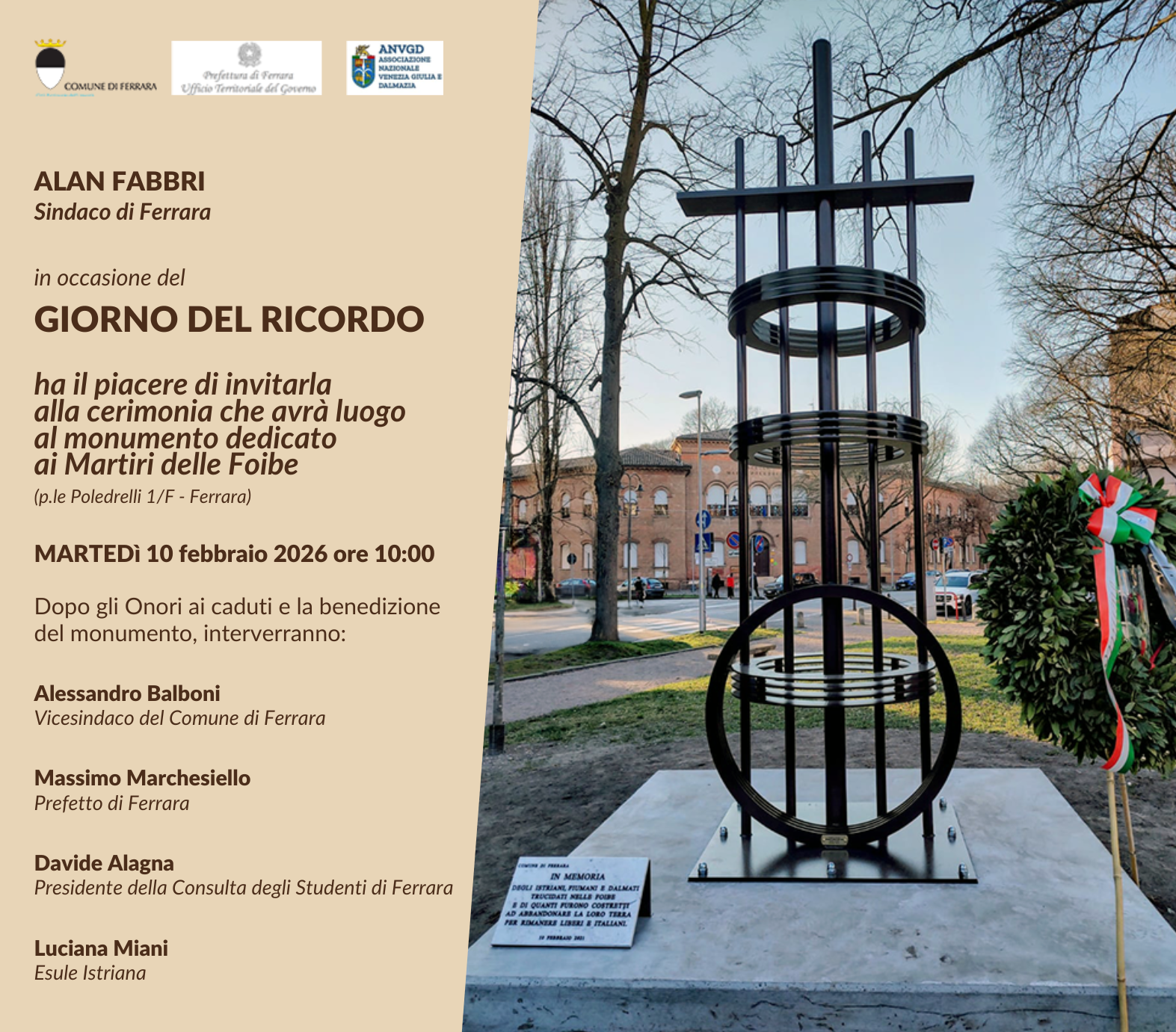 In occasione della ricorrenza del "Giorno del Ricordo", martedì 10 febbraio 2026 alle 10 avrà luogo una cerimonia di commemorazione davanti al monumento dedicato ai Martiri delle Foibe (p.le Poledrelli 1/F Ferrara), alla presenza delle Autorità civili, militari e religiose, delle Associazioni combattentistiche e d'arma e delle Scuole del territorio.