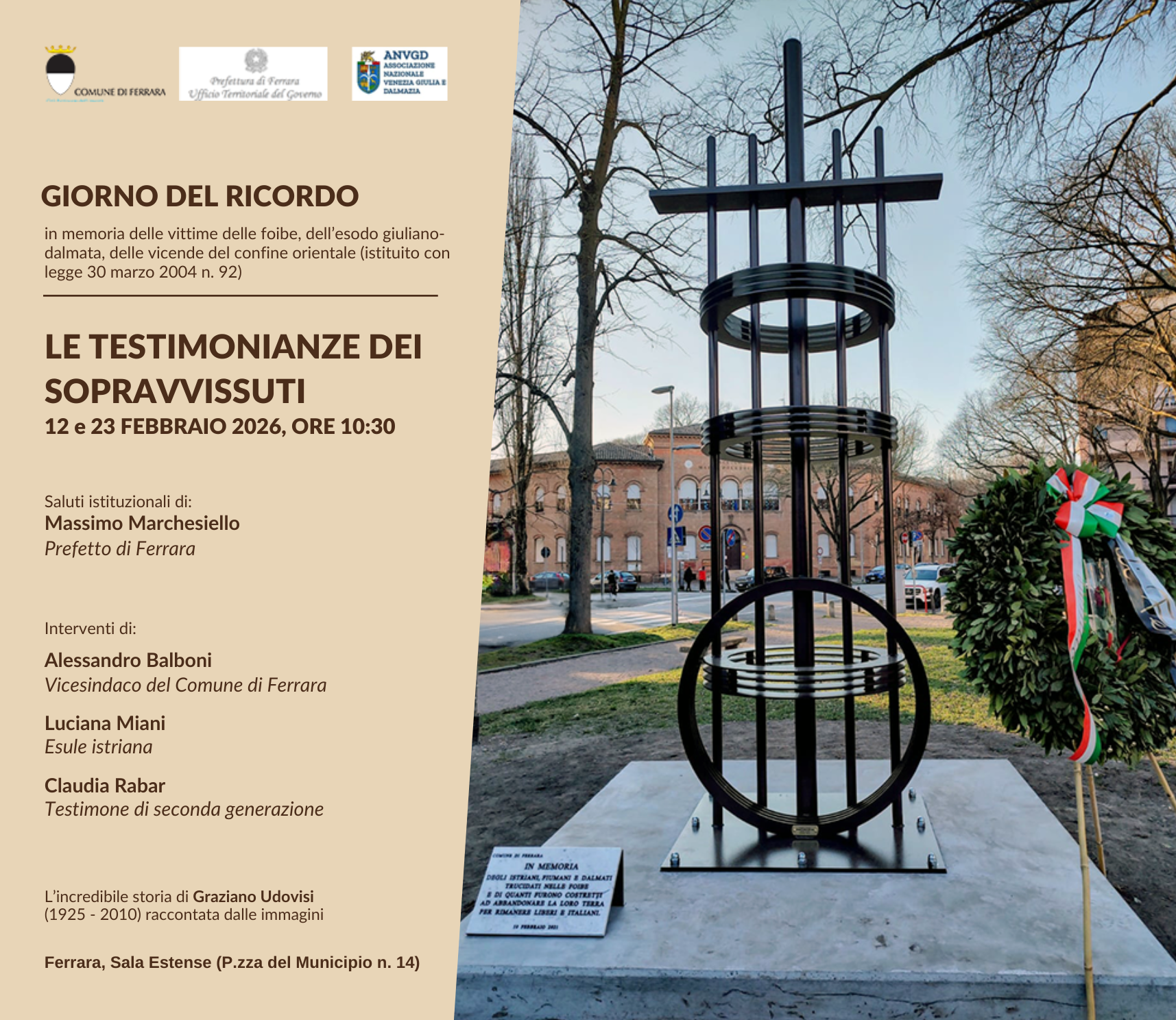 Oltre alla cerimonia pubblica del 10 febbraio 2026, in memoria delle vittime delle foibe, dell'esodo giuliano-dalmata, delle vicende del confine orientale (istituito con legge 30 marzo 2004 n. 92), il programma 2026 del "Giorno del Ricordo" prevede giovedì 12 e lunedì 23 febbraio 2026 alla Sala Estense (piazza Municipio, ore 10.30) due incontri con gli studenti delle scuole ferraresi dal titolo "LE TESTIMONIANZE DEI SOPRAVVISSUTI - L'incredibile storia di Graziano Udovisi (1925 - 2010) raccontata dalle immagini".
