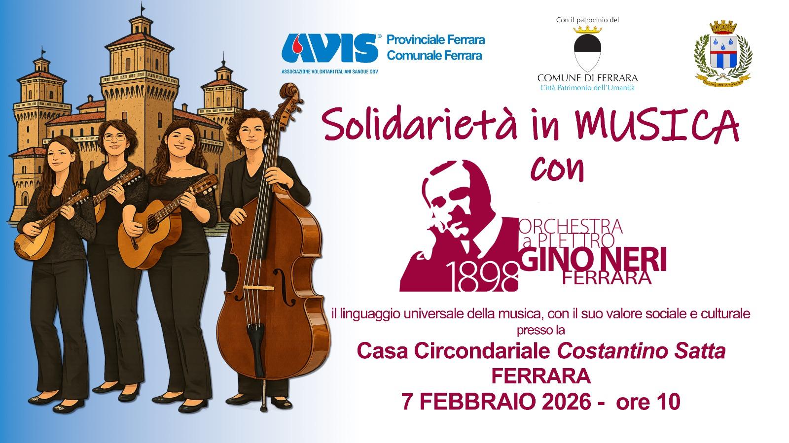 Creare un ponte tra la comunità esterna e la vita che scorre all'interno del carcere, grazie ad una giornata che promette spensieratezza, all'insegna della musica di qualità. Si chiama "Solidarietà in Musica" ed è l'iniziativa, creata dalla sinergia tra le Avis Provinciale e Comunale e l'orchestra a plettro "Gino Neri", che sabato 7 febbraio 2026 alle ore 10 si svolgerà presso la Casa Circondariale "Costantino Satta" di Ferrara. Per l'occasione, l'istituto penitenziario di via Arginone si trasformerà in una sorta di teatro dove i detenuti potranno beneficiare di un momento tutto dedicato a loro, in cui ritrovare speranza e leggerezza.