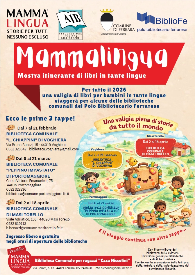 E' partita dalla biblioteca comunale Casa Niccolini di Ferrara la speciale valigia con 90 libri per bambini in tante lingue diverse che dal 7 al 21 febbraio 2026 farà tappa alla biblioteca comunale 'L. Chiappini' di Voghiera per il primo appuntamento della mostra itinerante "Mamma Lingua. Storie per tutti, nessuno escluso". Per l'occasione, sabato 7 febbraio alle 10:00, in apertura della mostra, è in programma un intervento della dottoressa Monica Malventano pediatra di Voghiera che illustrerà i progetti 'Mammalingua-Storie per tutti nessuno escluso' e 'Nati per leggere'.