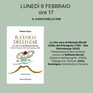 Ripercorre la ricca biografia di Michele Rivelli, sullo sfondo delle vicende storiche europee tra Settecento e Ottocento, il romanzo storico di Raffaele Riccio dal titolo "Il cuoco dello zar" (Edizioni dell'Ippogrifo, 2025) che lunedì 9 febbraio 2026 alle 17:00 sarà presentato nella sala Agnelli della biblioteca comunale Ariostea (via delle Scienze 17, Ferrara).