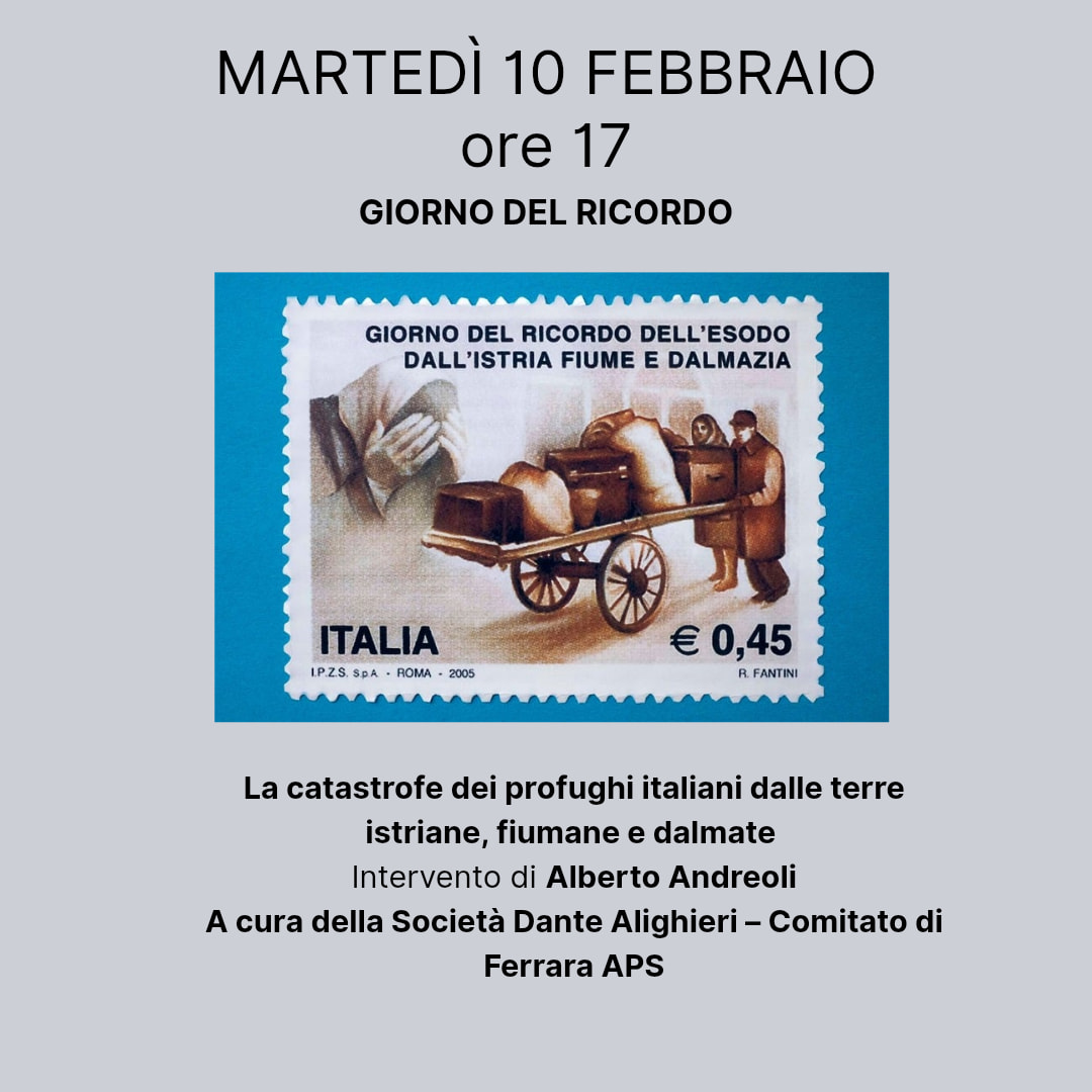 In occasione del Giorno del Ricordo, la Società Dante Alighieri - Comitato di Ferrara APS propone, per martedì 10 febbraio 2026 alle 17:00, nella sala Agnelli della biblioteca comunale Ariostea (via delle Scienze 17, Ferrara), un momento di riflessione a cura di Alberto Andreoli su "La catastrofe dei profughi italiani dalle terre istriane, fiumane".
