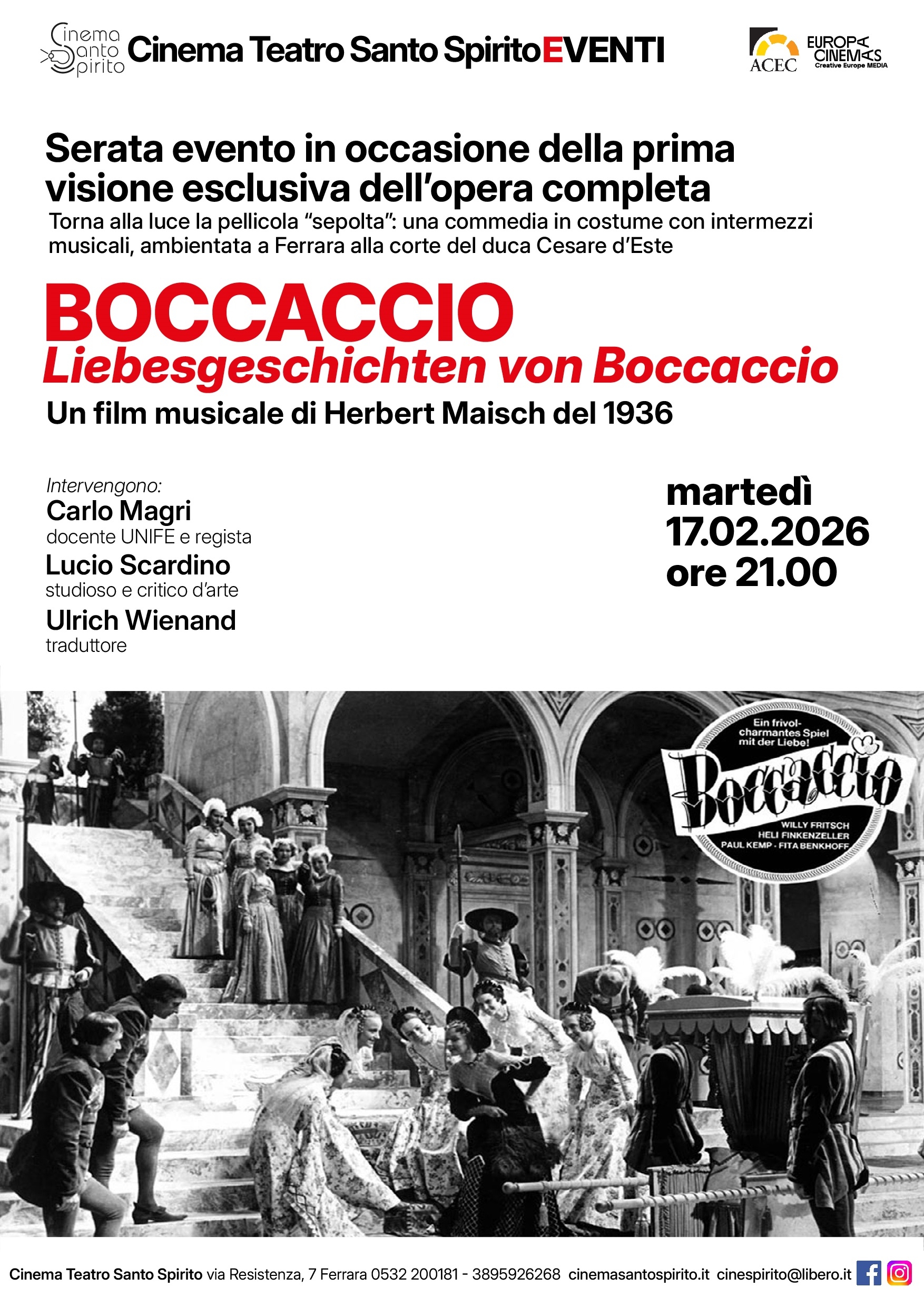 Martedì 17 febbraio 2026 alle 21:00 si terrà una serata evento al Cinema Teatro Santo Spirito (via Resistenza, 7 Ferrara) in occasione della prima visione esclusiva dellʼopera completa "Boccaccio - Liebesgeschichten von Boccaccio", film musicale di Herbert Maisch del 1936.