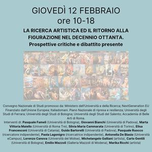 Ha per titolo "La ricerca artistica ed il ritorno alla figurazione nel decennio Ottanta. Prospettive critiche e dibattito presente" il Convegno Nazionale di Studi in programma giovedì 12 febbraio 2026 dalle 10:00 alle 18:00 nella sala Agnelli della biblioteca comunale Ariostea (via delle Scienze 17, Ferrara).