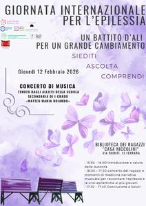 Un pomeriggio tra musica e narrazione per raccontare con serenità a bambini e ragazzi cos'è l'epilessia. E' l'appuntamento in programma per giovedì 12 febbraio 2026 alle 15:50 alla biblioteca comunale di Casa Niccolini (via Romiti 13, Ferrara), in occasione delle iniziative cittadine per la Giornata internazionale dell'epilessia, organizzate con il supporto dell'Assessorato alle Politiche Sociosanitarie del Comune di Ferrara. Nel corso dell'evento, dal titolo "Un battito d'ali per un grande cambiamento", gli allievi della scuola secondaria di I grado "Matteo Maria Boiardo" di Ferrara, guidati dal prof. Roberto Felloni, si esibiranno in concerto e musicheranno letture di medicina narrativa per bambini e ragazzi sul tema dell'epilessia.