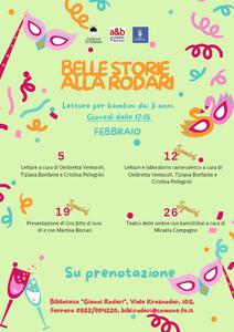 Un pomeriggio per festeggiare il Carnevale in allegria, tra letture e creatività. E' quello in programma per le bambine e i bambini dai 3 anni, giovedì 12 febbraio 2026 alle 17:15 alla biblioteca comunale Rodari di Ferrara (viale Krasnodar 102). In compagnia di Ombretta Venturoli, Cristina Pellegrini e Tiziana Bonfante dell'Associazione CIRCI, i piccoli partecipanti potranno ascoltare tante storie divertenti e partecipare a un laboratorio carnevalesco.