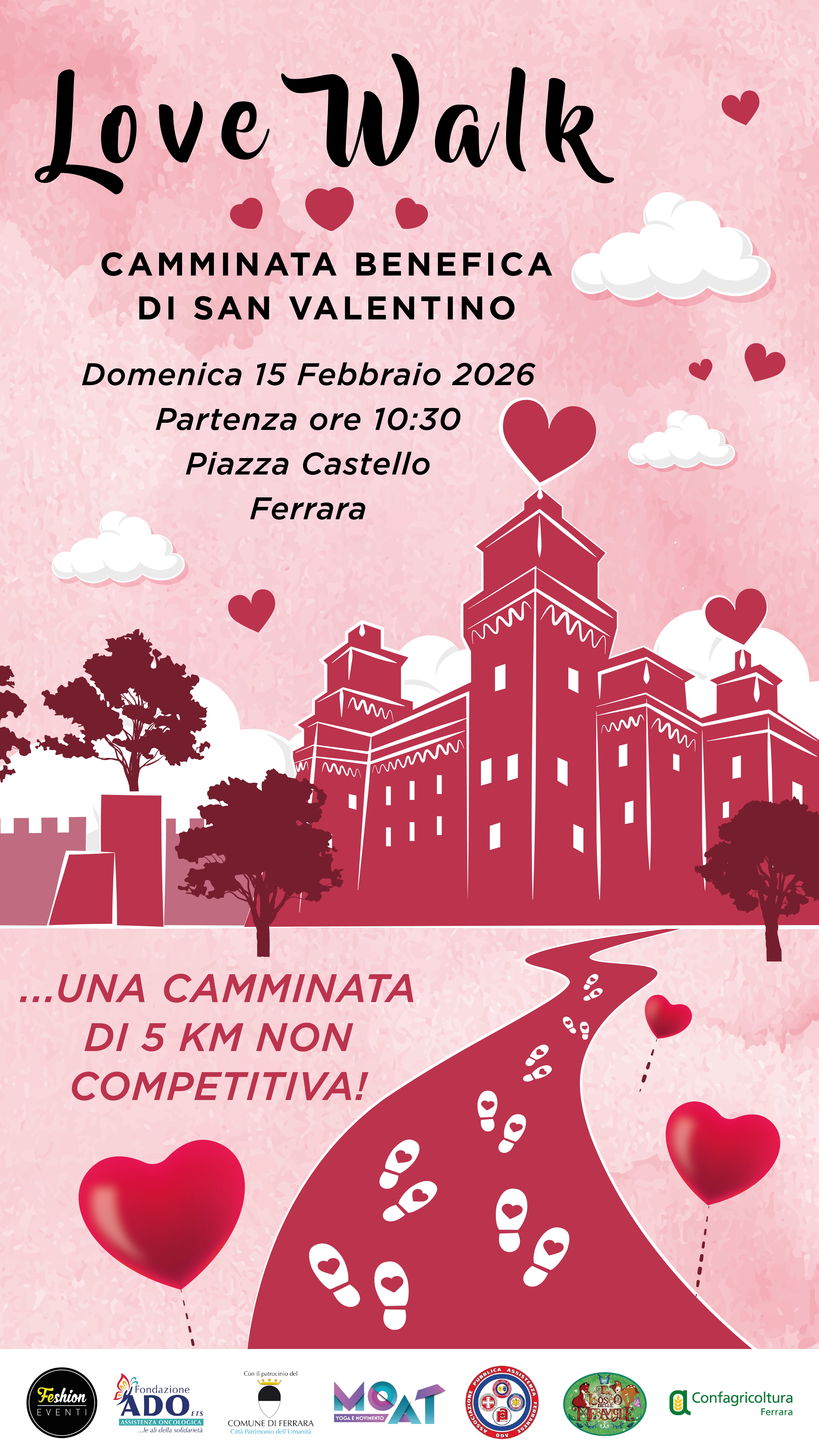 "Camminare con il cuore, insieme, per chi ha bisogno". Con questo slogan Ferrara è pronta ad accogliere nuovamente la "Love Walk", manifestazione che, giunta alla sua 9a edizione, caratterizza ormai il San Valentino ferrarese. Una passeggiata dell'amore, dell'amicizia e della solidarietà, quella che anche quest'anno la Fondazione Ado farà scattare, domenica 15 febbraio 2026 con ritrovo a partire dalle 9.30 all'ombra del Castello Estense (inizio riscaldamento ore 10.30 e camminata alle 10.45).