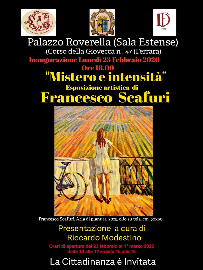 Lunedì 23 febbraio 2026 alle 18:00 il Circolo dei Negozianti di Palazzo Roverella (Corso della Giovecca n. 47 - Ferrara) ospiterà l'inaugurazione dell'esposizione artistica di Francesco Scafuri dal titolo «Mistero e intensità», che proseguirà nei giorni seguenti fino all'1 marzo (orari di apertura dalle 10 alle 12 e dalle 15 alle 19). A presentare l'evento e a illustrare i quadri in mostra sarà Riccardo Modestino.