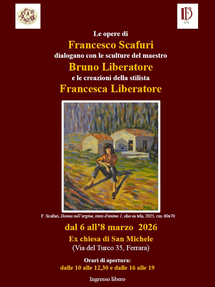 Dal 6 all'8 marzo 2026 all'interno dell'ex chiesa di San Michele (via del Turco n. 35 - Ferrara), con orari di apertura dalle 10 alle 12,30 e dalle 16 alle 19, Francesco Scafuri esporrà al pubblico alcune sue opere artistiche di grandi dimensioni, in dialogo con le sculture del maestro Bruno Liberatore e le creazioni della figlia Francesca Liberatore, stilista di fama internazionale. L'evento è promosso dalla famiglia Liberatore, in collaborazione con le associazioni De Humanitate Sanctae Annae OdV e Ferrariae Decus ETS.