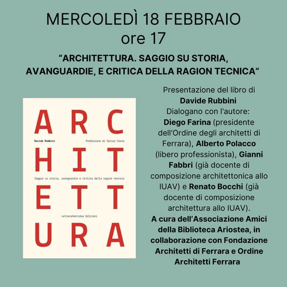 Si intitola "Architettura" il saggio su "storia, avanguardie e critica della ragion tecnica" di Davide Rubbini (edizioni LetteraVentidue, 2023) che mercoledì 18 febbraio 2026 alle 17:00 sarà presentato nella sala Agnelli della biblioteca comunale Ariostea (via Scienze 17, Ferrara).