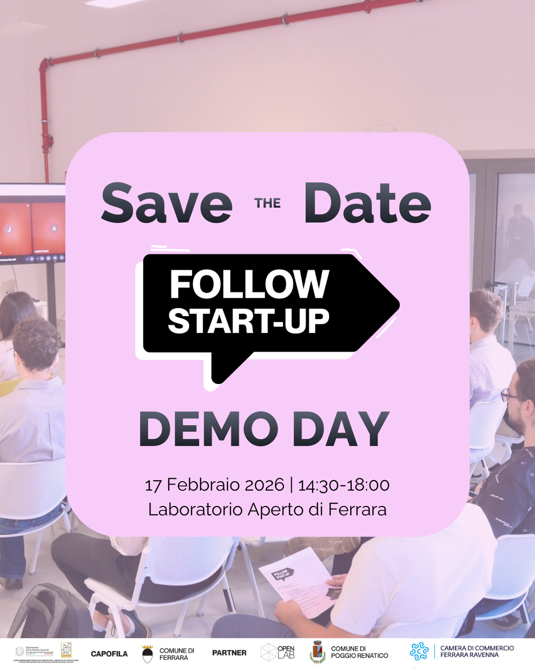 Martedì 17 febbraio 2026 dalle 14:30, nella sede del Laboratorio Aperto di Ferrara (in via Castelnuovo 10 - Ex Teatro Verdi) si svolgerà il 'Demo Day' del progetto 'Follow Startup'.