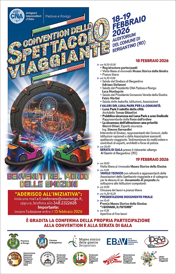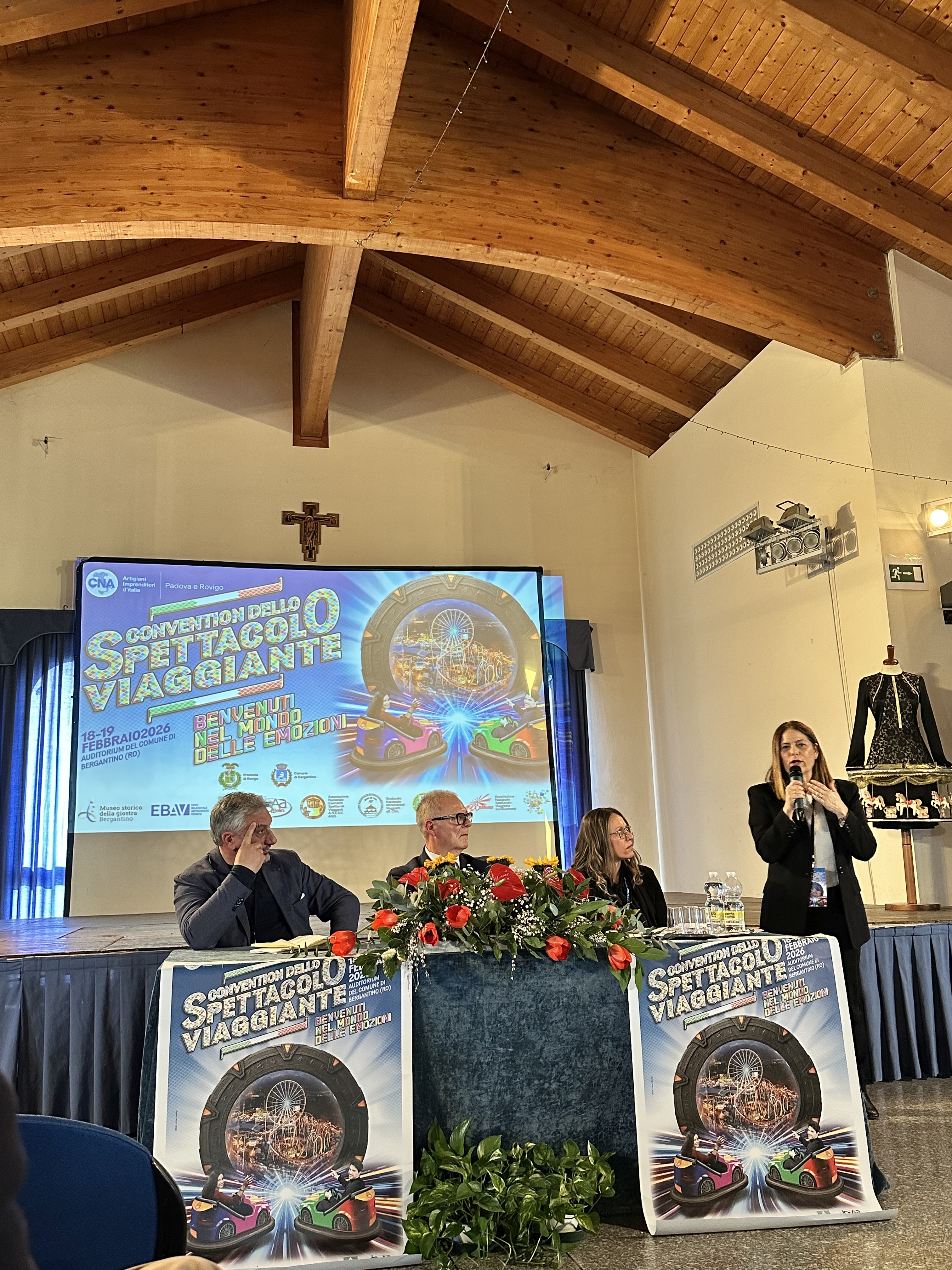 Anche il Comune di Ferrara, con l'assessore Angela Travagli, ha voluto prendere parte alla 'Convention nazionale sullo Spettacolo Viaggiante', iniziata oggi (18 febbraio 2026) a Bergantino (Rovigo), come occasione di confronto tra Istituzioni, Regioni e Comuni sul futuro del comparto dell'Amusement e del Luna Park in Italia.