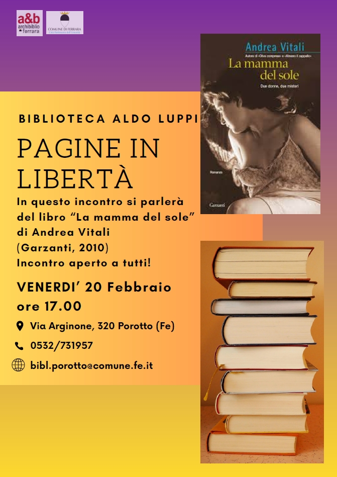 E' in programma per venerdì 20 febbraio 2026, alle 17:00 il nuovo appuntamento del gruppo di lettura "Pagine in Libertà" alla biblioteca comunale Aldo Luppi (via Arginone 320, Porotto).