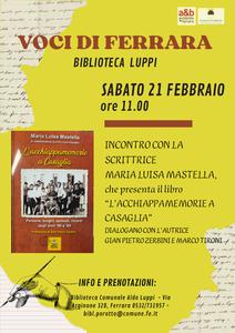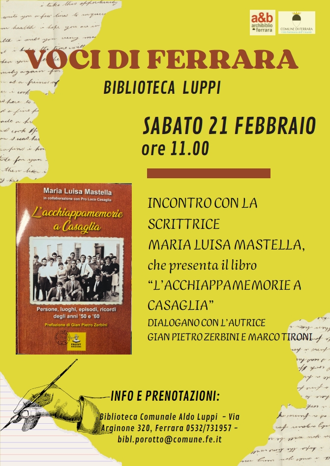 Sarà Maria Luisa Mastella, con il suo libro "L'acchiappamemorie a Casaglia - Persone, luoghi, episodi, ricordi degli anni '50 e '60", la protagonista, sabato 21 febbraio 2026 alle 11:00, del nuovo appuntamento del ciclo di incontri con scrittori e scrittrici ferraresi "Voci di Ferrara" alla biblioteca comunale Aldo Luppi (via Arginone 320, Porotto).