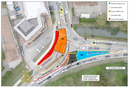 L'accensione dei semafori regolerà il transito in tutte le fasi degli interventi di Hera e Comune, sino al completamento della realizzazione dell'anello definitivo della nuova rotatoria.