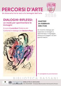 Proporrà un possibile personale metodo per interpretare le immagini dell'arte l'incontro, a cura di Lucia Boni (Galleria del Carbone) e Barbara Pizzo, dal titolo 'Dialoghi-Riflessi' in programma martedì 24 febbraio 2026 alle 17:00 alla biblioteca comunale Bassani (via Grosoli 42, Barco, Ferrara).