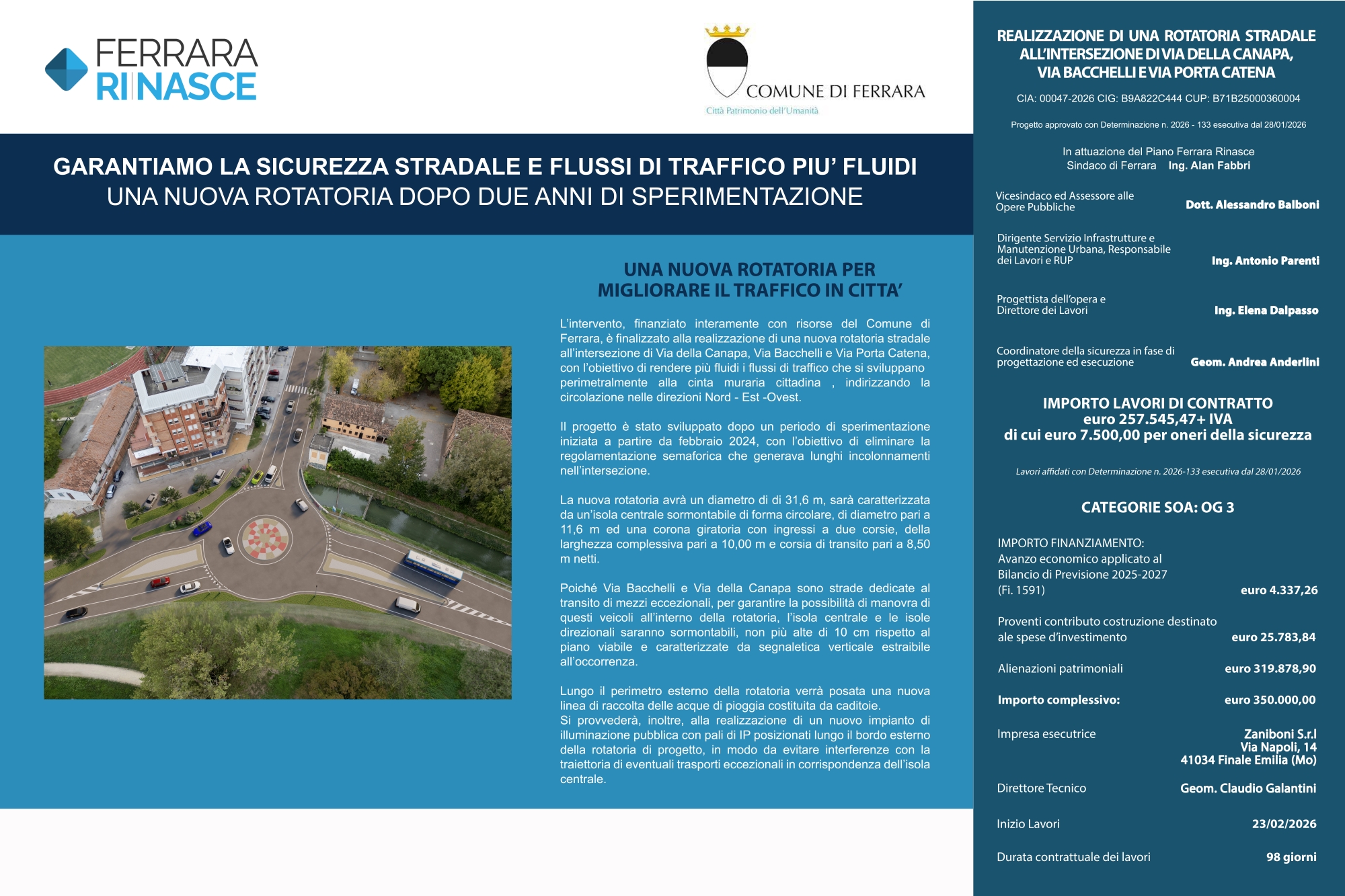 Sicurezza stradale e fluidità del traffico: è con queste finalità che il Comune di Ferrara si appresta a realizzare la nuova rotatoria all'intersezione tra le vie Bacchelli, Canapa e Porta Catena.