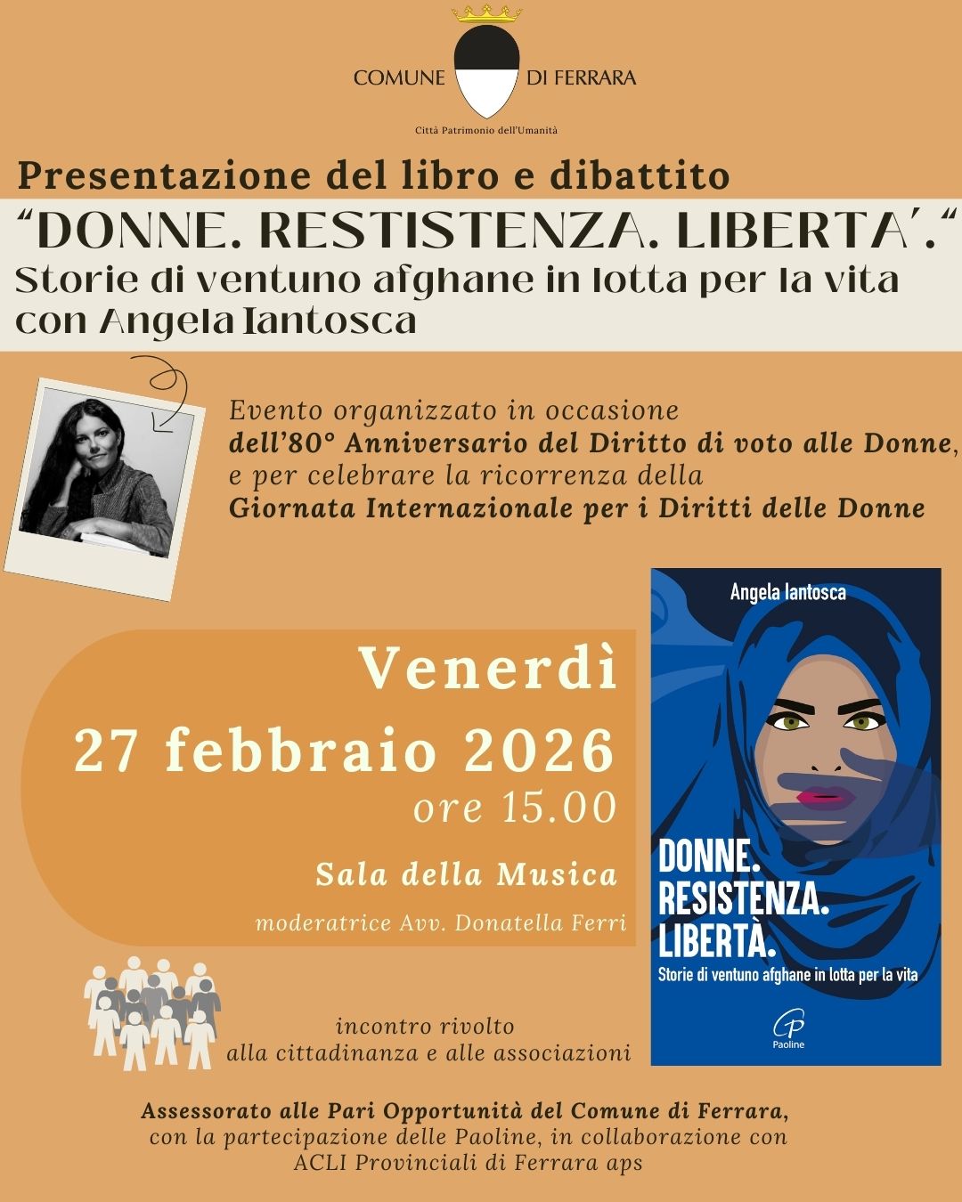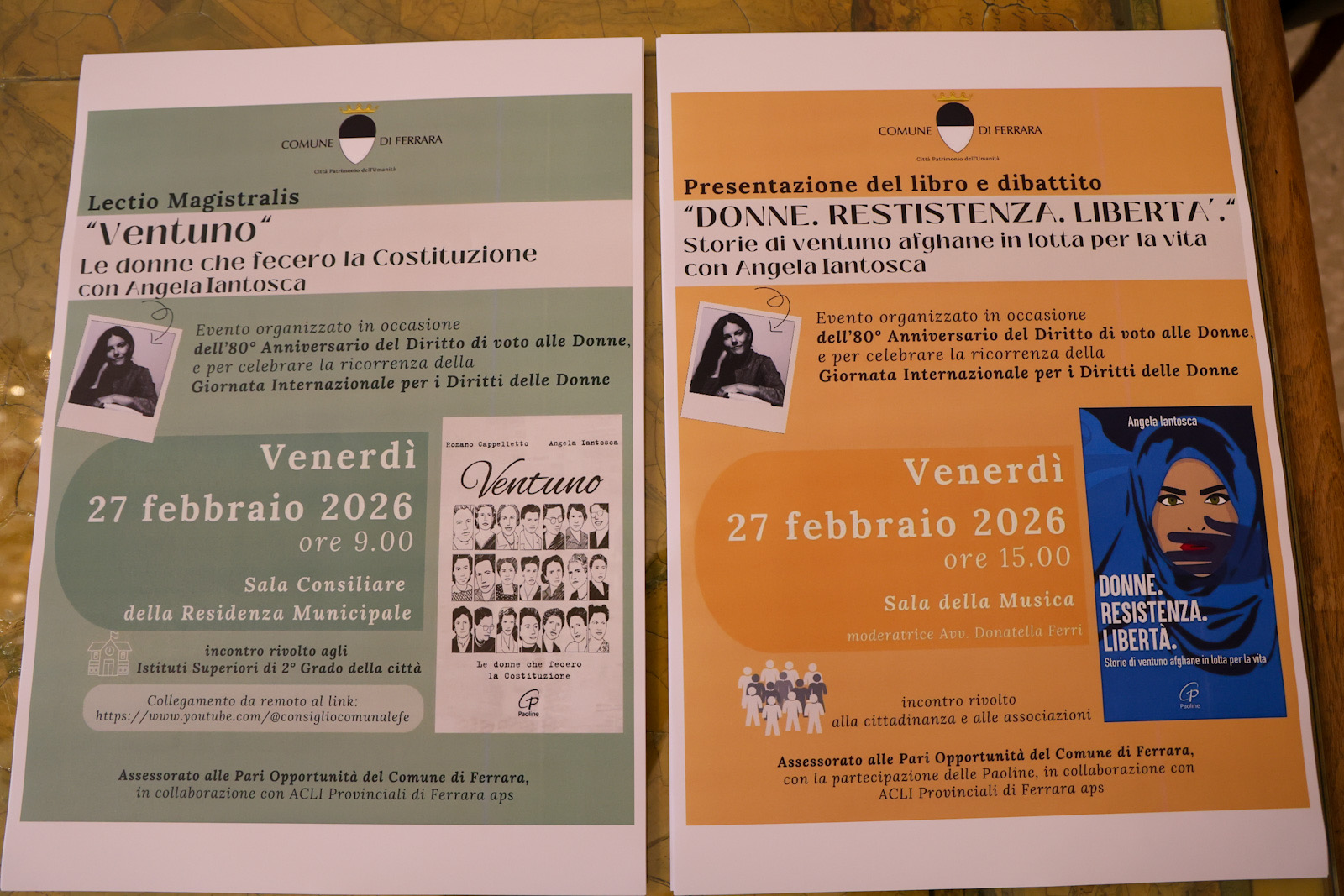 Doppio appuntamento che punta i riflettori sull'importante ruolo svolto dalle donne nel redigere la Costituzione italiana e nella lotta e resistenza per analoghi diritti di democrazia e libertà da parte delle donne afgane. L'iniziativa è curata dall'Amministrazione comunale di Ferrara per celebrare la "Giornata Internazionale dei diritti della donna" nella giornata di venerdì 27 febbraio 2026.