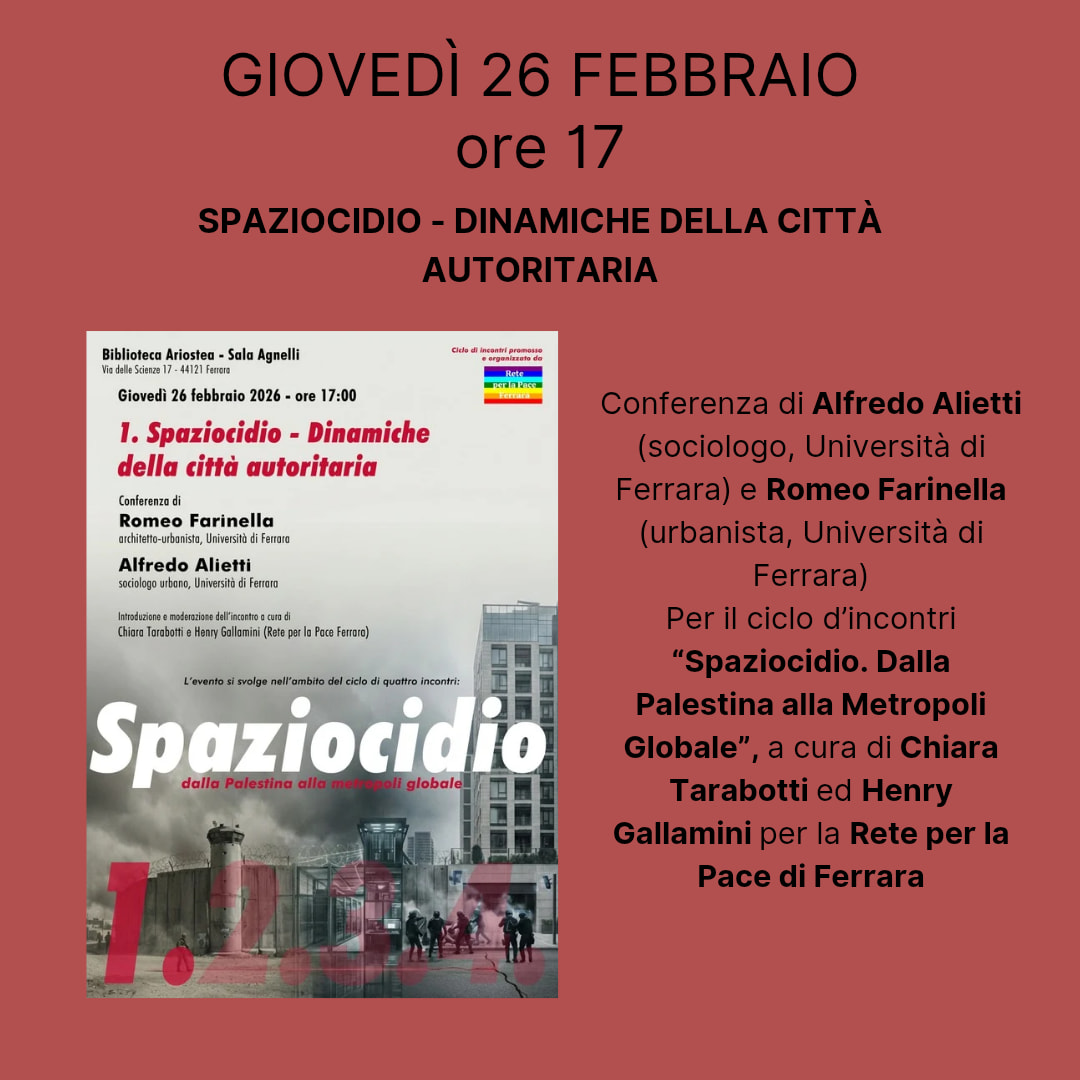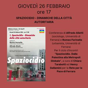 Avrà per tema il concetto di 'Spaziocidio', nelle sue varie accezioni, la conferenza di Alfredo Alietti (sociologo, Università di Ferrara) e Romeo Farinella (urbanista, Università di Ferrara) in programma giovedì 26 febbraio 2026, alle 17:00, nella sala Agnelli della biblioteca comunale Ariostea (via Scienze 17, Ferrara).