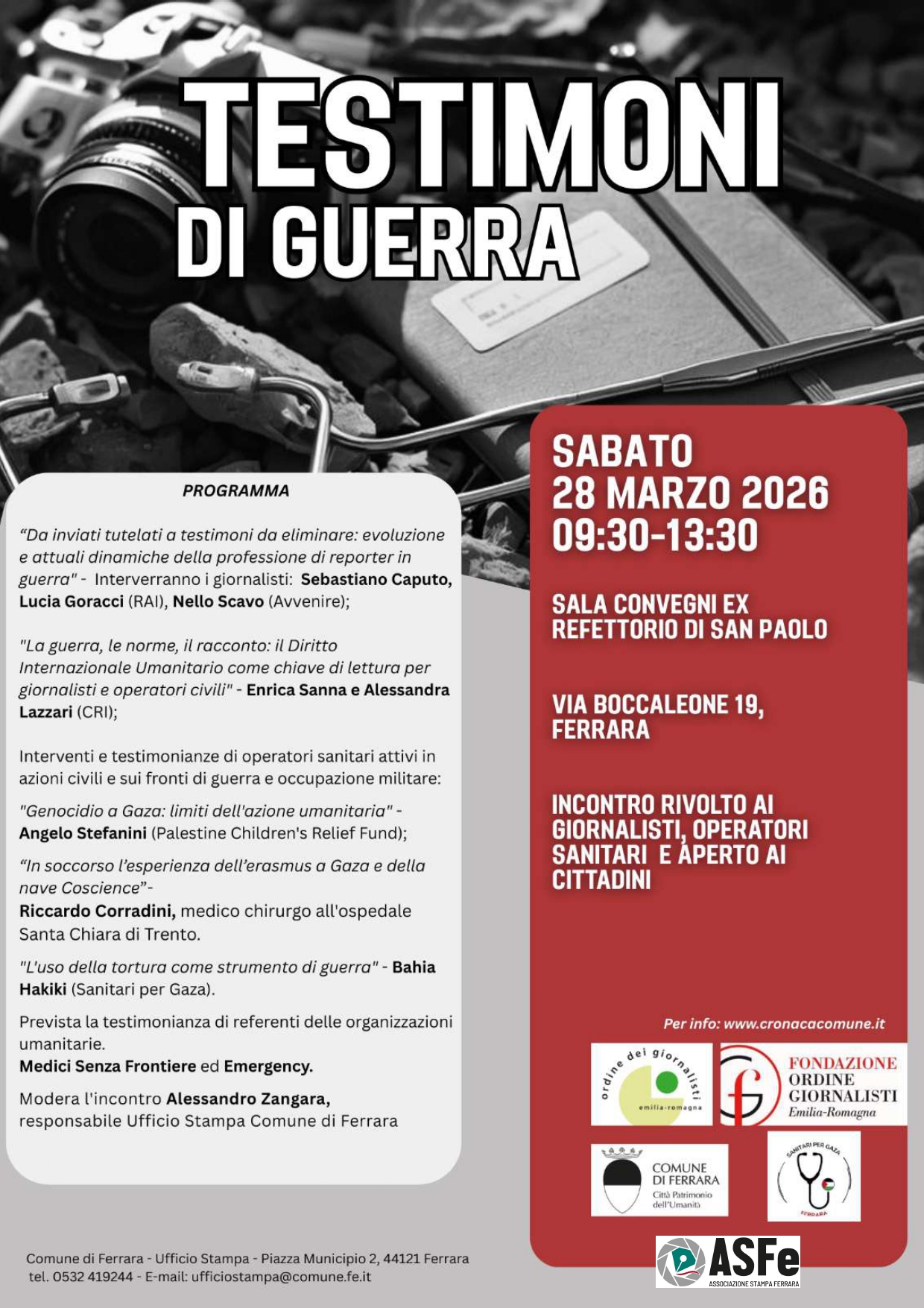 Sabato 28 marzo 2026 dalle 9:30 alle 13:30, nella sala comunale ex Refettorio di San Paolo in via Boccaleone, 19 a Ferrara, avrà luogo un seminario rivolto a giornalisti e operatori sanitari, aperto ai cittadini, dal titolo "Testimoni di guerra: operatori sanitari e giornalisti, bersagli sul fronte", analisi degli scenari, testimonianze dirette, deontologia e diritto internazionale umanitario.