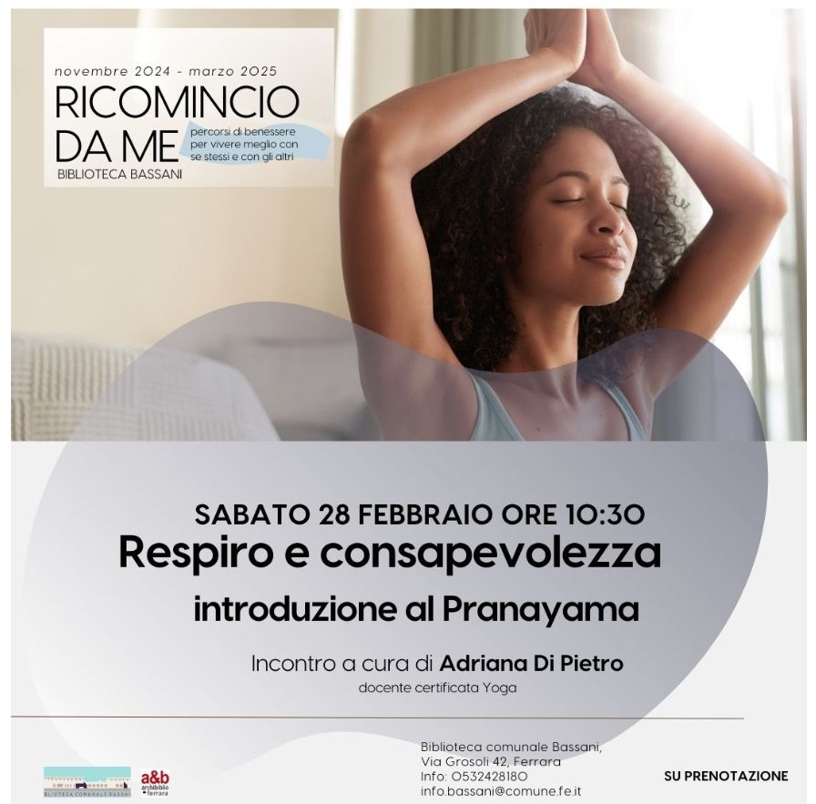 Sarà dedicato alla pratica del Pranayama il nuovo appuntamento, sabato 28 febbraio 2026 alle 10:30, con la rassegna "Ricomincio da me" alla biblioteca comunale Bassani (via Grosoli 42, Barco, Ferrara).