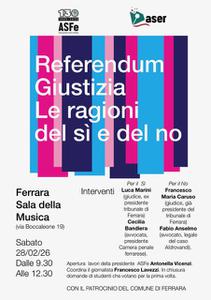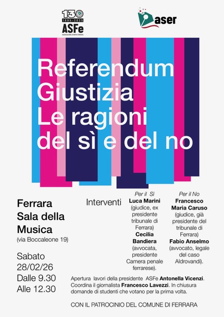 Mettere a confronto le ragioni del No e le ragioni del Sì sul referendum della giustizia per offrire una informazione il più completa e neutra possibile: è questo l'obiettivo dell'evento promosso da Associazione Stampa Ferrara per sabato 28 febbraio (sala della Musica, via Boccaleone 19, dalle 9:30 alle 12:30) chiamando a dibattere magistrati e avvocati e "accompagnare così i cittadini nella comprensione di una materia molto tecnica ribadendo, oggi più che mai, l'importanza fondamentale che ha il voto, espressione democratica di ogni libero cittadino", spiegano i promotori.