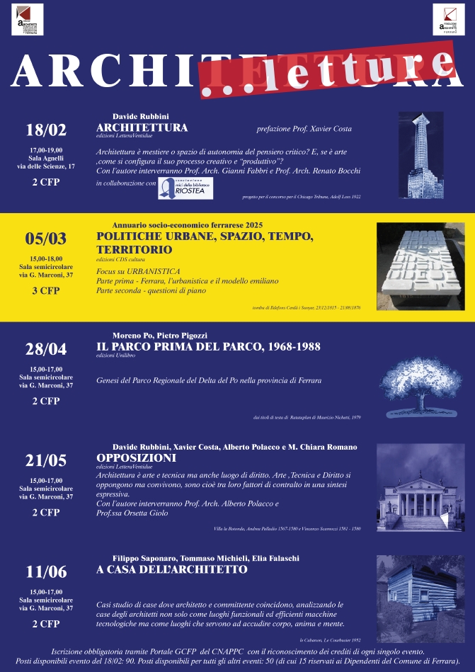 L'Ordine e la Fondazione degli architetti PPC della Provincia di Ferrara, nel secondo appuntamento del ciclo "ARCHI...letture", giovedì 5 marzo 2026, dalle 15:00 alle 18:00, nella sala semicircolare di via G. Marconi 37 a Ferrara presentano il libro "Annuario socio-economico ferrarese 2025 - Politiche urbane, spazio, tempo, territorio" CDS cultura edizione (con iscrizione obbligatoria tramite il portale GCFP con riconoscimento di 3CFP per gli architetti).