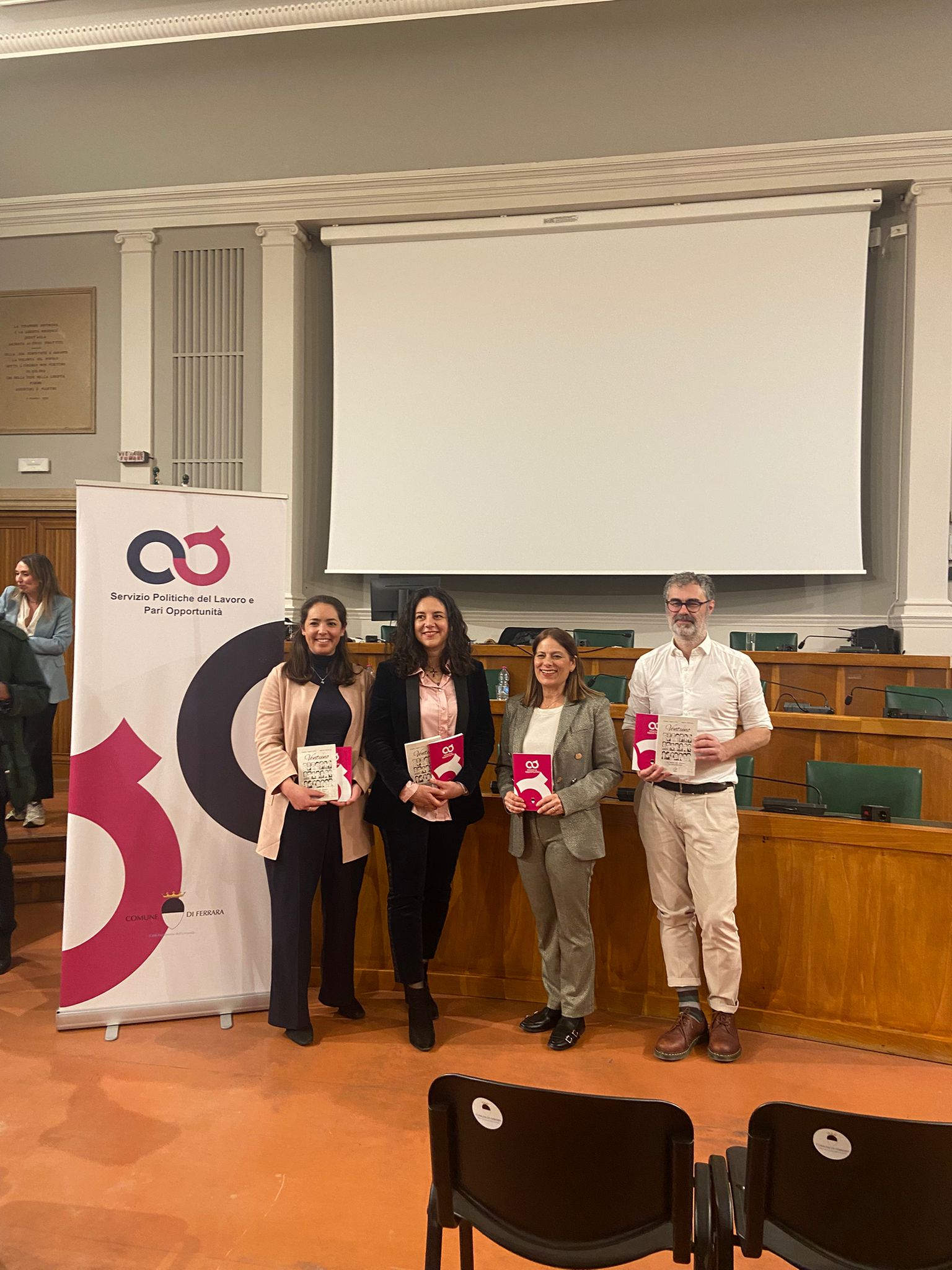 Nelle foto alcuni momenti della riunione della Commissione consiliare Pari Opportunità svoltasi giovedì 12 marzo 2026 che ha visto l'assessore comunale Angela Tavagli relazionare sul tema "Dall'Assemblea Costituente alle Olimpiadi: 80 anni di emancipazione femminile" insieme a il docente di storia moderna dell'Università degli Studi di Ferrara Matteo Provasi, l'avvocata cassazionista Donatella Ferri e l'avvocata di Diritto Sportivo e Rapporti di Lavoro nello Sport Martina De Bernardin.