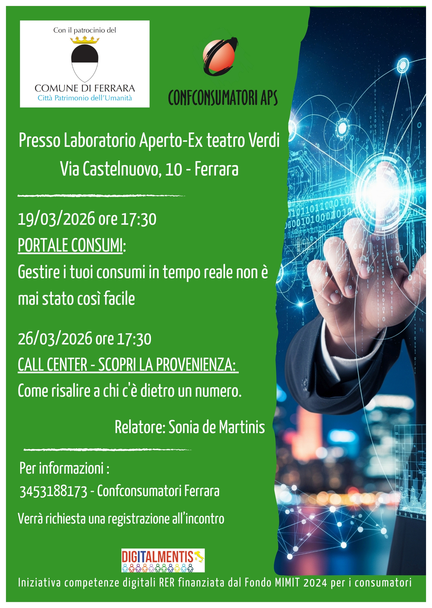 Come si può gestire e monitorare al meglio i propri consumi domestici di luce e gas? E' possibile scoprire chi c'è dietro a una chiamata da un numero sconosciuto? E' per rispondere a queste e ad altre domande utili per la vita di tutti i giorni che Confconsumatori Ferrara ha organizzato due incontri pubblici gratuiti, giovedì 19 e giovedì 26 marzo 2026 alle 17:30 al Laboratorio Aperto-ex Teatro Verdi di Ferrara, con il patrocinio dell'Amministrazione comunale.