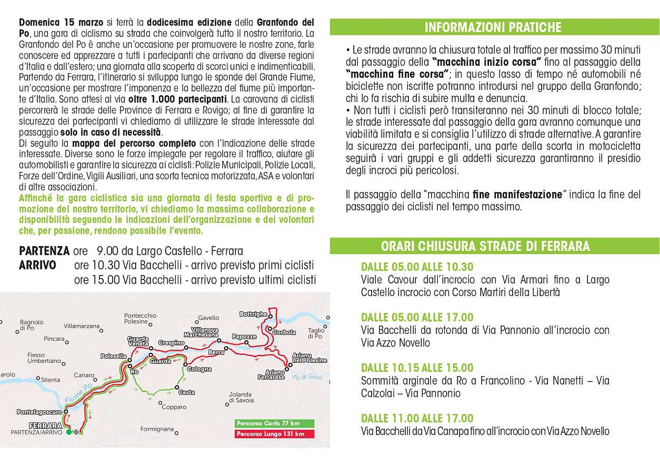 In occasione della gara ciclistica'Granfondo del Po' organizzata a Ferrara dalla Società Po River asd per la giornata di domenica 15 marzo 2026, nelle strade cittadine inserite nei percorsi di gara sono previste modifiche alla viabilità.