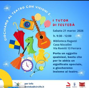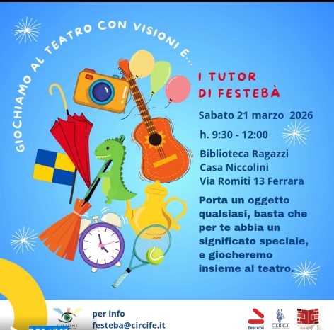 E' in programma per sabato 21 marzo 2026 alle 9:30 il nuovo appuntamento con 'Visioni. Piccola scuola di Festebà Festival' alla biblioteca comunale di Casa Niccolini (via Romiti 13, Ferrara). Bambini e ragazzi potranno partecipare al laboratorio "Giochiamo al teatro" a cura dei tutor del Gruppo di lavoro di Festebà.