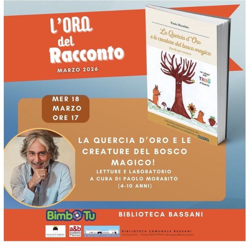 Sarà Paolo Morabito, autore del libro per adulti e bambini "La Quercia d'Oro e le creature del bosco magico", il protagonista del nuovo appuntamento con "L'ora del racconto" in programma mercoledì 18 marzo 2026 alle 17:00, alla biblioteca comunale Bassani (Via G. Grosoli, 42 Barco, Ferrara).