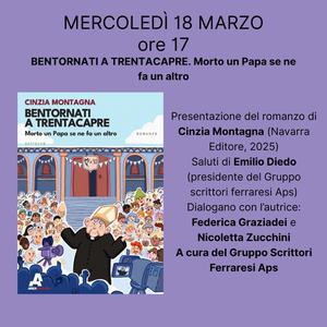 Racconta le divertenti vicende di un immaginario piccolo paese della provincia italiana il romanzo di Cinzia Montagna "Bentornati a Trentacapre. Morto un Papa se ne fa un altro" (Navarra Editore, 2025) che, mercoledì 18 marzo 2026 alle 17:00, sarà presentato nella sala Agnelli della biblioteca comunale Ariostea (via Scienze 17 Ferrara).
