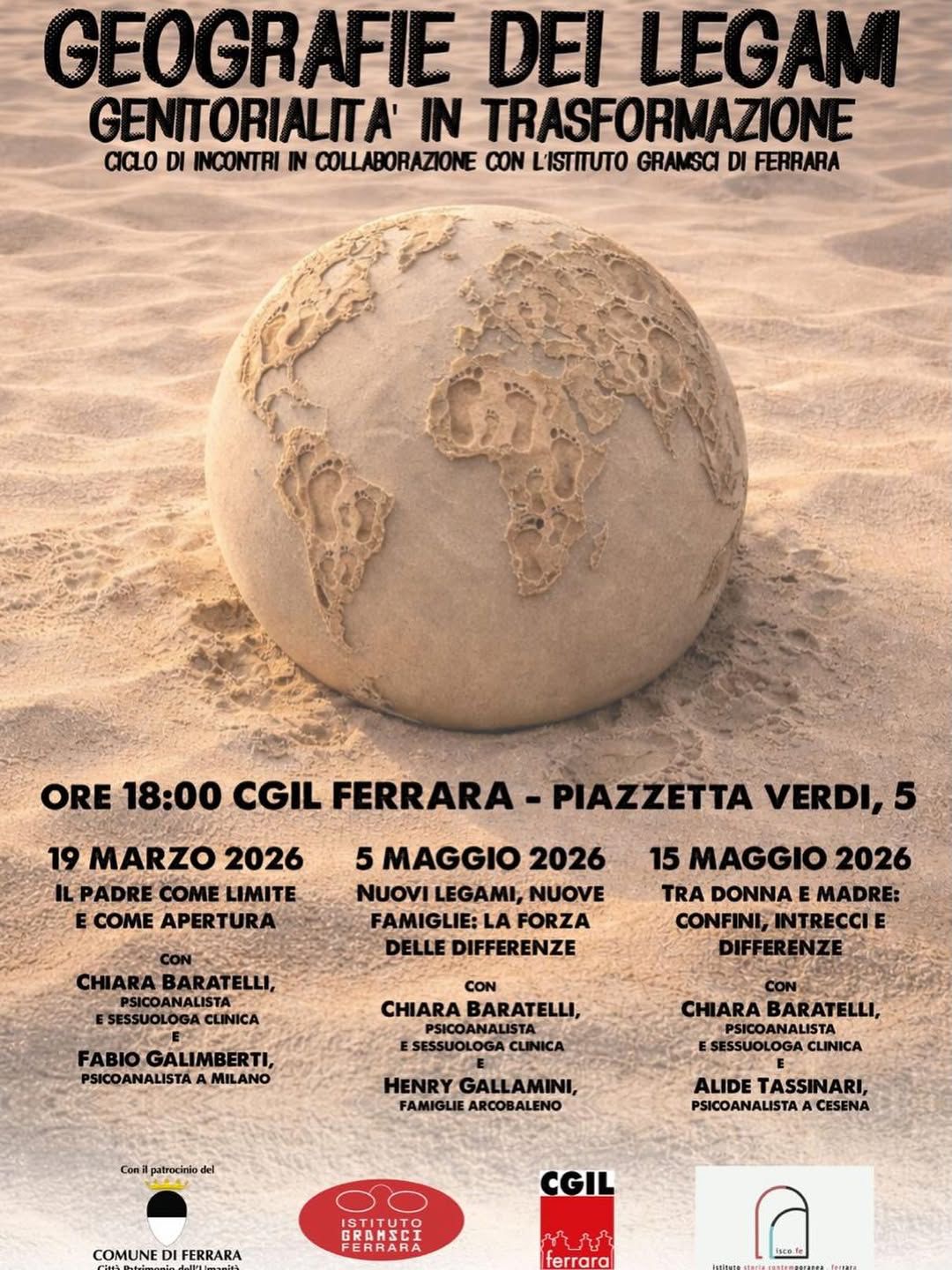 Giovedì 19 marzo 2026 alle 18.00, nella sede della Camera del Lavoro di Ferrara (piazza Verdi, 5), si terrà il primo appuntamento del ciclo "Geografie dei legami". Genitorialità in trasformazione". L'incontro, intitolato "Il padre come limite e come apertura" sarà tenuto da Chiara Baratelli (psicoanalista e sessuologa clinica) in dialogo con Fabio Galimberti (psicoanalista a Milano).