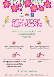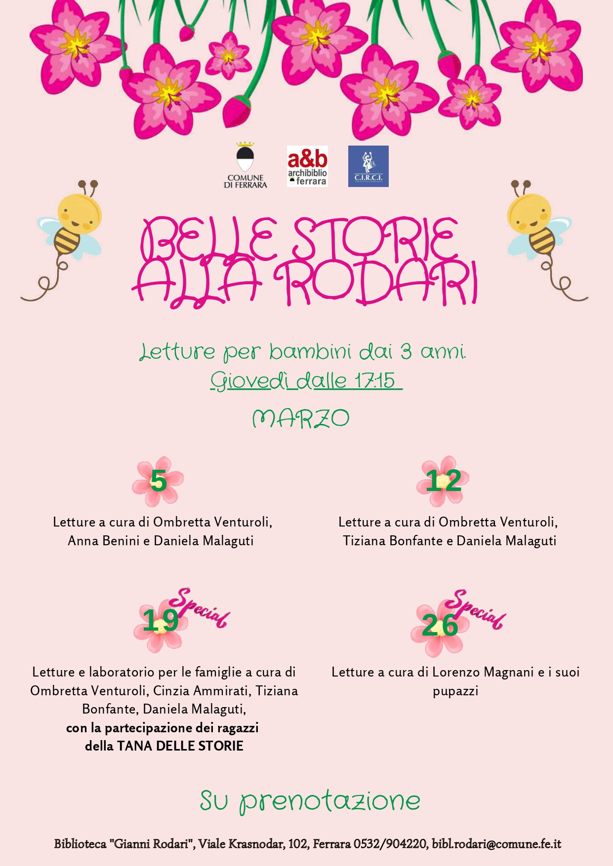 Le letture di "Belle Storie" alla biblioteca comunale Rodari di Ferrara (viale Krasnodar 102) si preparano alla primavera. Per l'appuntamento di giovedì 19 marzo 2026 alle 17:15 in programma, per bambine e bambini dai 3 anni, tanti racconti divertenti e coinvolgenti e un laboratorio creativo in compagnia di Ombretta Venturoli, Cinzia Ammirati, Daniela Malaguti e Tiziana Bonfante dell'Associazione CIRCI, con la partecipazione dei ragazzi della 'Tana delle storie'.