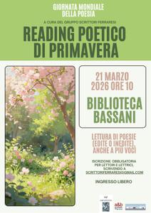 In occasione della Giornata mondiale della poesia sabato 21 marzo 2026 alle 10:00 la biblioteca comunale Bassani (via Grosoli 42, Barco, Ferrara) ospiterà una mattinata di letture poetiche, a cura del Gruppo Scrittori Ferraresi, aperta all'ascolto della cittadinanza.