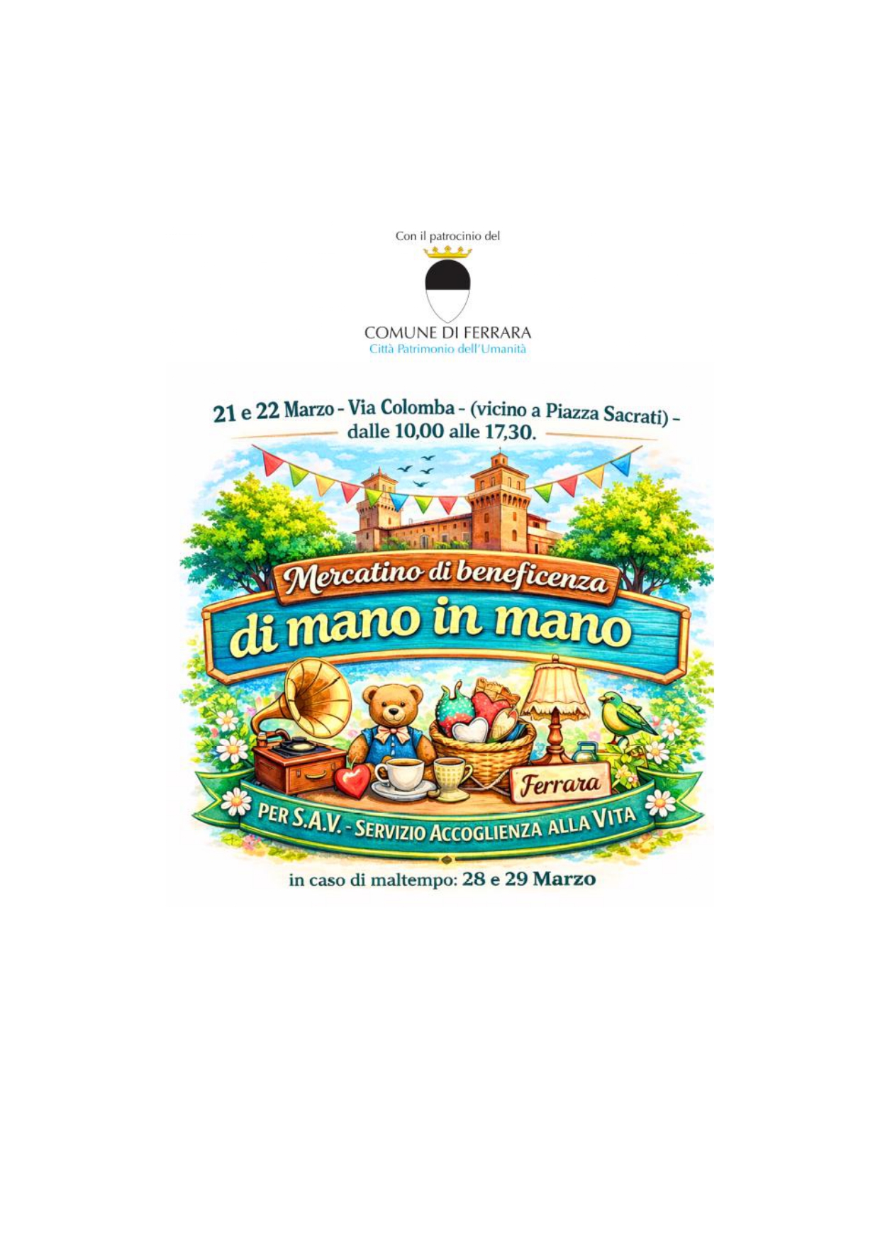 Tornano in città gli inconfondibili colori e il grande calore solidale grazie alla prima edizione del mercatino "Di mano in mano", promosso da un gruppo di amiche in favore dall'associazione Servizio Accoglienza alla Vita (Sav) che da quasi 40 anni è attiva sul territorio a sostegno di famiglie con bambini piccoli in difficoltà. L'iniziativa, patrocinata dall'assessorato alle Politiche Sociosanitarie del Comune di Ferrara, si terrà sabato 21 e domenica 22 marzo dalle ore 10 alle 17.30 in via Colomba (limitrofa a Piazza Sacrati).