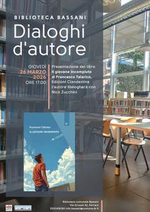 È un racconto di formazione quello contenuto nel romanzo "Il giovane incompiuto" di Francesco Talarico che giovedì 26 marzo 2026 alle 17:00 sarà protagonista del nuovo appuntamento con la rassegna "Dialoghi d'autore", alla biblioteca comunale Bassani (via Grosoli 42, Barco, Ferrara).