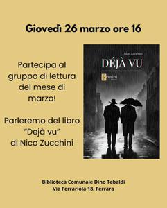 E' in programma per giovedì 26 marzo 2026 alle 16:00 il nuovo incontro del gruppo di lettura "Sangiò'" alla biblioteca comunale Tebaldi (via Ferraiola 12, Ferrara). Si parlerà del libro "Dejà-Vu" di Nico Zucchini. L'incontro offrirà ai partecipanti l'occasione per condividere idee e impressioni sulla lettura.