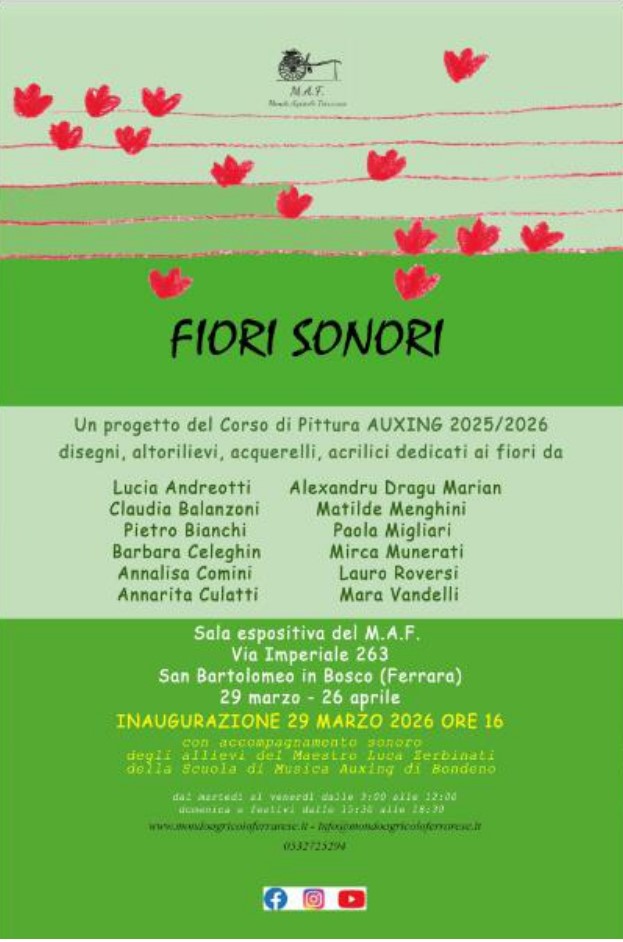 Interessanti esempi artistici saranno in primo luogo proposti dal Gruppo di Pittura Auxing di Bondeno con la mostra dal titolo "Fiori sonori". Curatore dell'esposizione e del relativo catalogo è l'artista Gianni Cestari, da anni autorevole personalità del mondo pittorico estense nonché divulgatore appassionato di questa splendida arte.
