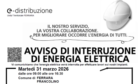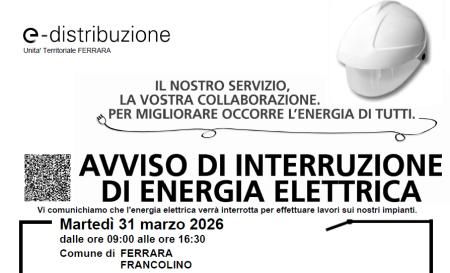 Martedì 31 marzo 2026 dalle 9:00 alle 16:30 in località Francolino (Ferrara), è prevista la sospensione dell'energia elettrica per lavori, a cura di E-Distribuzione, di potenziamento della rete elettrica a media tensione, volti al miglioramento della qualità del servizio elettrico.