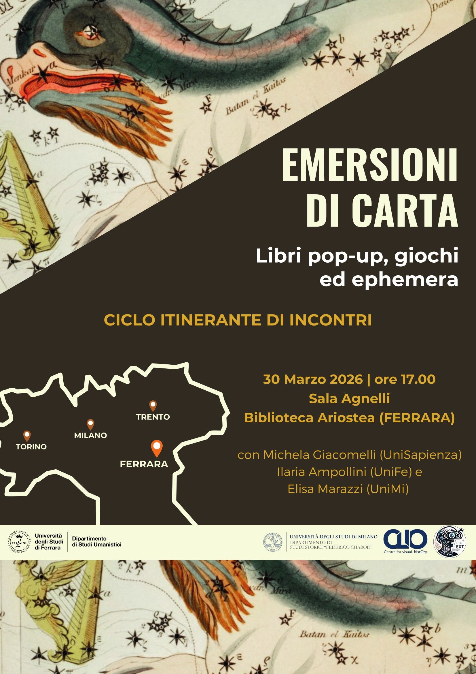 Sarà dedicato alle fonti cartacee non convenzionali della storia visuale l'incontro a cura di Elisa Marazzi (Università di Milano) e Ilaria Ampollini (Università di Ferrara) dal titolo 'Emersioni di carta. Libri pop-up, giochi ed ephemera' che si terrà lunedì 30 marzo 2026 alle 17:00 nella sala Agnelli della biblioteca Ariostea (via Scienze 17 Ferrara).